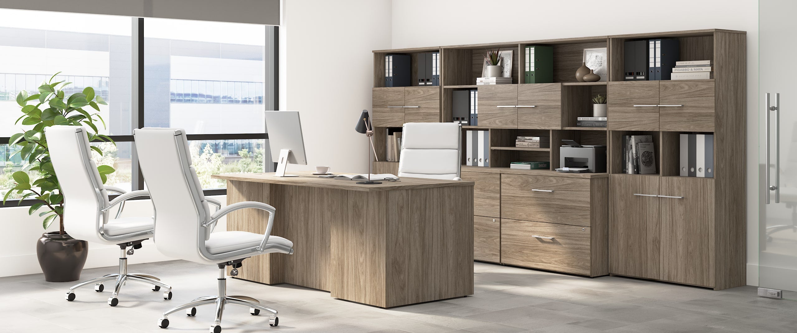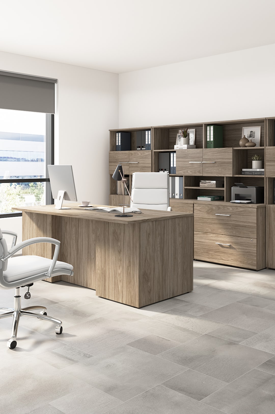 Executive desks with impressive breakfront designs and coordinating storage are ideal for showcasing the personalities and achievements of today’s professionals.